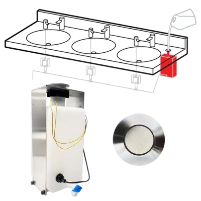 Save time and save your knees with ASI’s newest Top Fill Multi-Feed soap dispensing system. Fill up to 12 automatic liquid or foam soap dispensers with one pour using the counter fill port connected to a large capacity tank−a perfect addition to any high traffic washroom. This tank 1.6 gal (6L) tank is made of seamless molded plastic for leak-proof operation and is transparent to show soap level. Tank is mounted under the vanity, held in place by a mounting bracket, and is powered by an AC adapter. The polished chrome top fill port is equipped with sensors and LED to indicate low soap level, overfill protection, and battery conditions. KIT ONLY, DISPENSER NOT INCLUDED For battery powered operation, purchase 0385-BP separately.