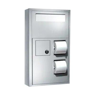 Holds and dispenses 1000 paper seat covers and two (2) rolls standard or 1800 sheet 4-1/2″ x 5-1/4″ diameter (114 x Ø133) toilet paper. Waste capacity of 300 cubic inches (.005m3 ) or 1.3 gal (4.9 liters). Includes stainless steel collar for surface mounting.