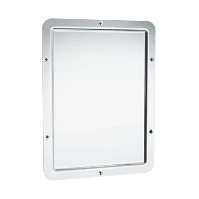 One piece 18 gauge type 304 stainless steel formed mirror with #8 mirror polish finish, integral frame, rounded corners and 6 mounting holes. 20 Gauge, No 8 mirror polish finish