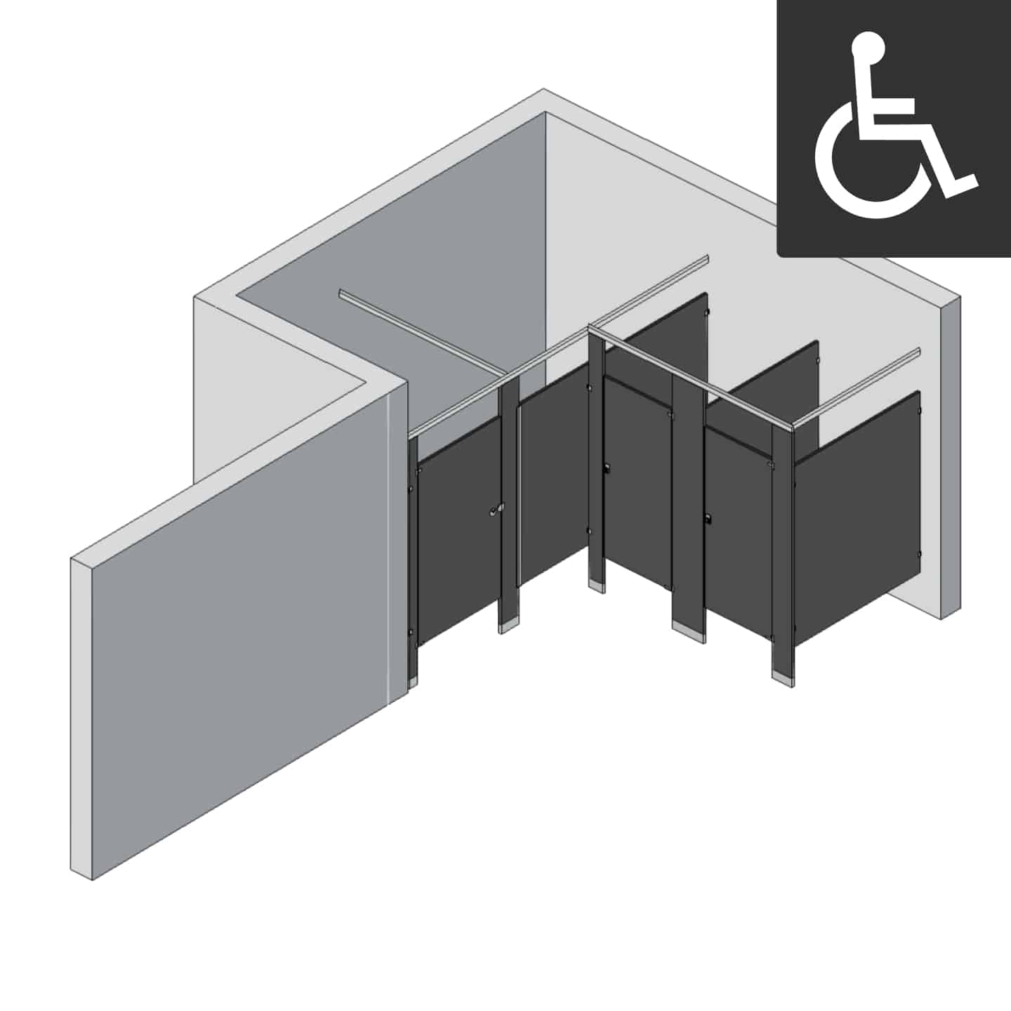 Create an accessible and space-efficient commercial restroom layout with this 3-stall left-hand alcove bathroom partition configuration featuring one ADA-compliant stall and two standard stalls. Designed to fit neatly within a left-hand alcove, this layout helps maximize restroom space while providing accessibility and dependable privacy for all users.