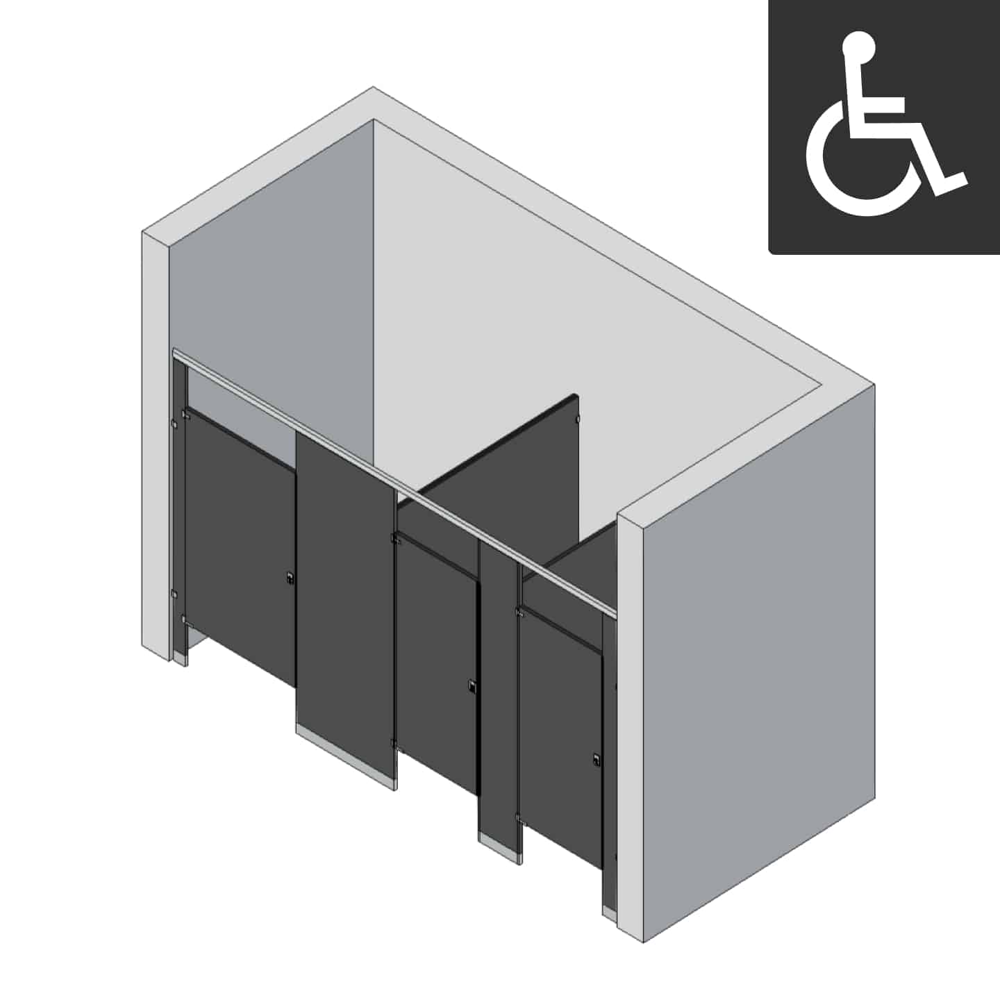 - ADA compliant stall measures 60″ x 60″ clear inside dimensions w/ 36″ outswing door