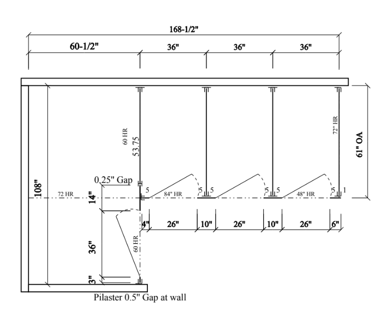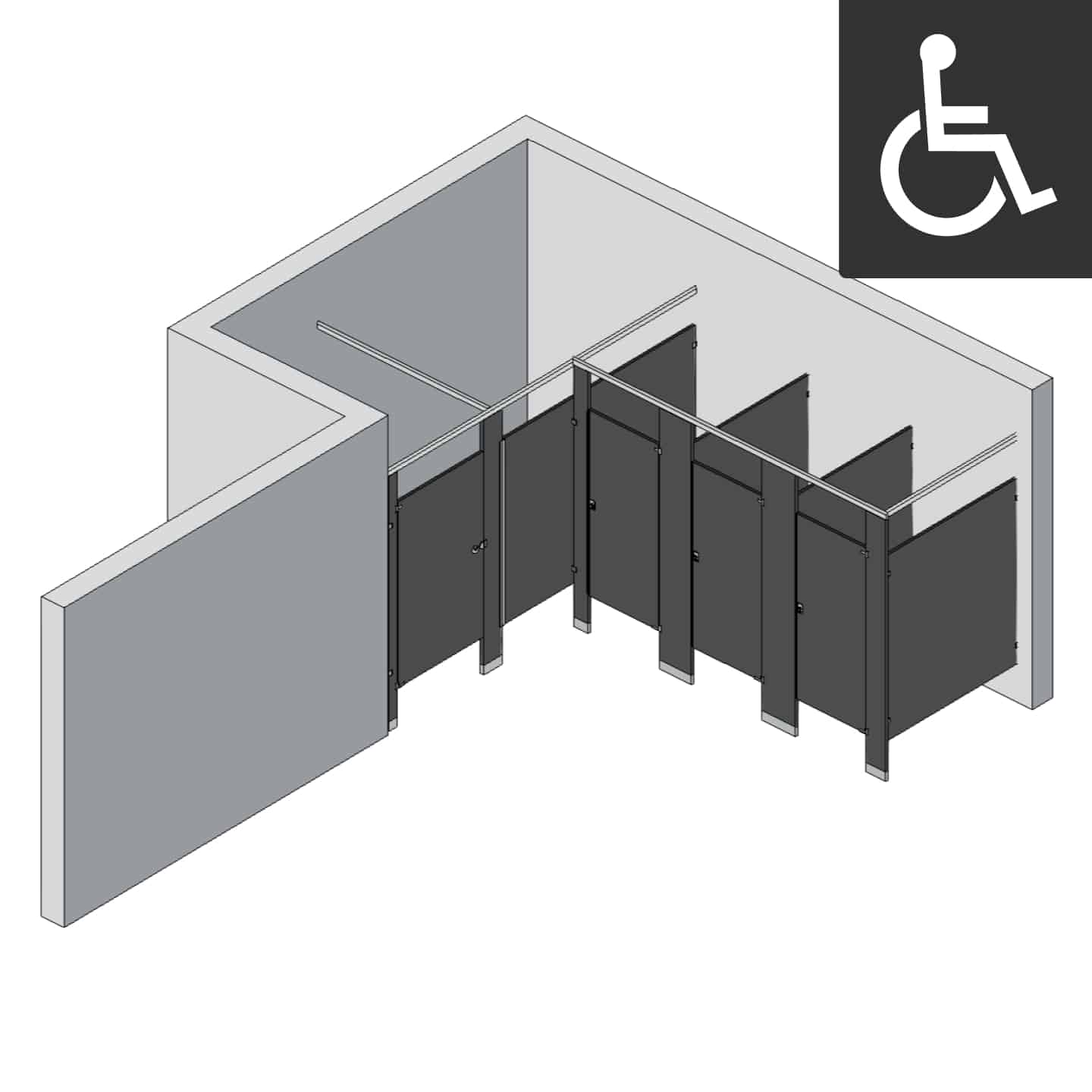 This 4-stall bathroom partition configuration with one ADA-compliant stall is designed for left-hand alcove restroom layouts, making it easy to create an accessible and efficient commercial restroom. The layout helps maximize available space while providing both privacy and comfort for all users.