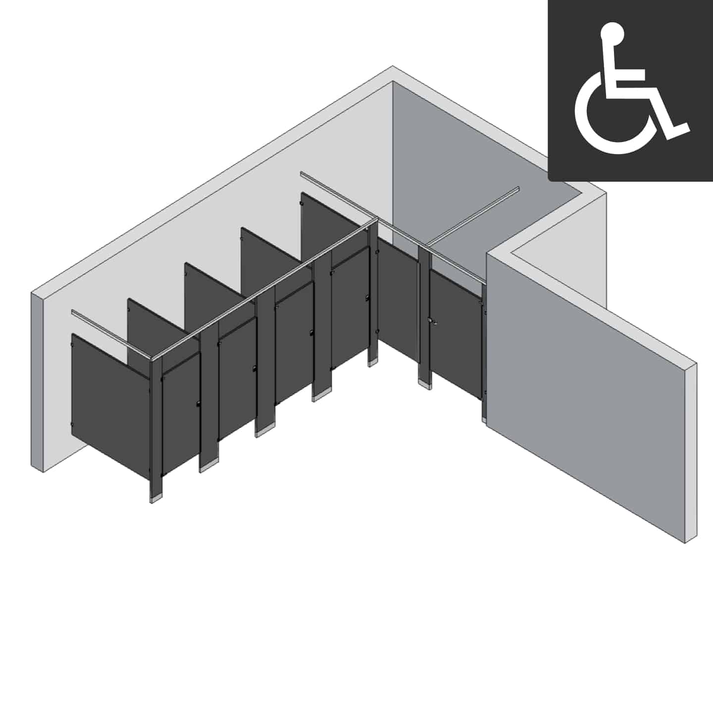 Design an accessible and space-efficient restroom with this 5-stall bathroom partition layout featuring one ADA-compliant stall, built specifically for right-hand alcove installations. This configuration delivers reliable privacy while meeting accessibility requirements and maximizing usable space in commercial restroom environments.