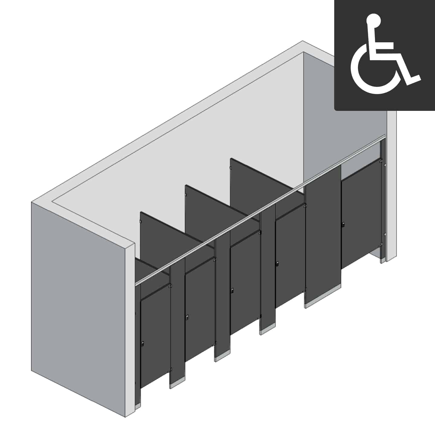 Optimize your commercial restroom with this 5-stall bathroom partition system featuring one ADA-compliant stall, designed for between-wall installations. This layout supports accessibility requirements while providing durable privacy partitions that help maximize restroom space.