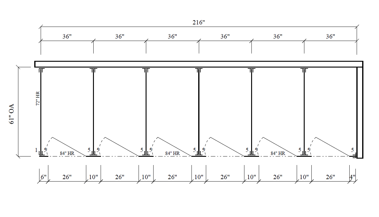 - Standard sized (non-ADA) stalls measure 36″ x 60″ w/ 26″ inswing door