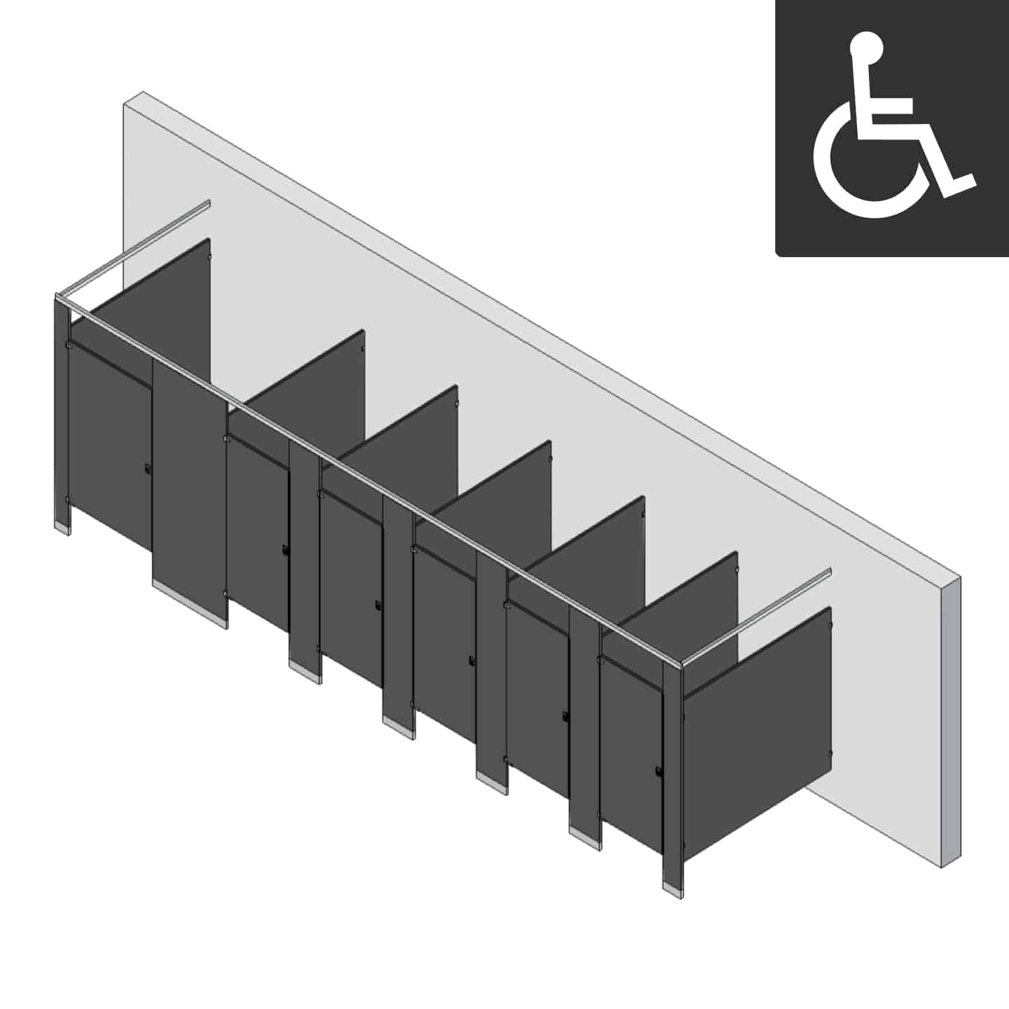 - ADA compliant stall measures 60″ x 60″ clear inside dimensions w/ 36″ outswing door