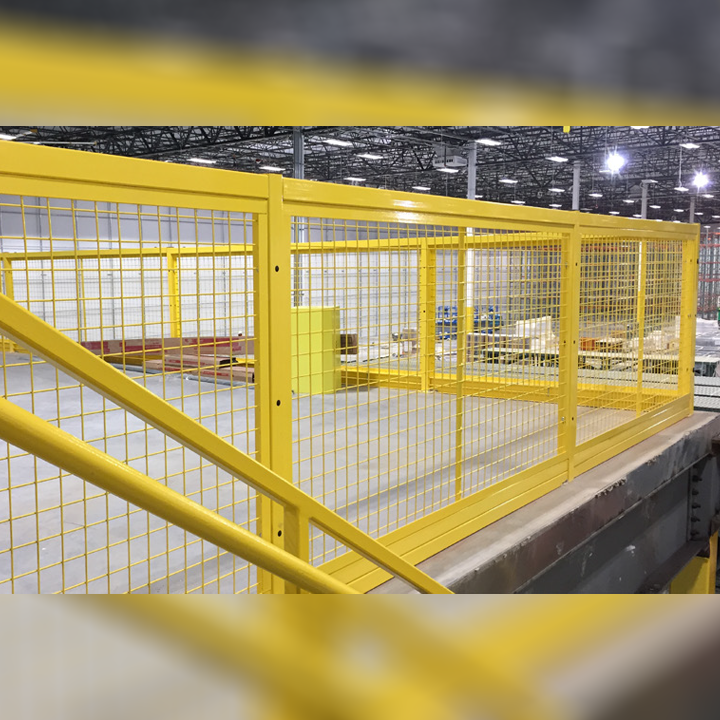 BeastWire Mezzanine RailGuard enables businesses to safely utilize elevated platforms as shop, office, or storage space. The full handrail system with wire mesh infill reduces risk, installs easily, and looks great. It is a perfect solution for platforms, catwalks, and stairwells in industrial spaces. Typical handrail systems provide stability and create a simple barrier against falls. BeastWire RailGuard goes a step further by reducing the open space below the railing. The addition of BeastWire mesh infill prevents shorter items from passing below the handrail and tumbling down to a lower level. As a modular system, BeastWire RailGuard is easy to install and customize. Create a railing that suits your work space by selecting the ideal mounting, panel, kick plate, and gate options from a range of choices. The appearance of BeastWire RailGuard is also customizable – several colors are available. Choose from square and diamond mesh infill patterns to fit the look – and function – of your space.