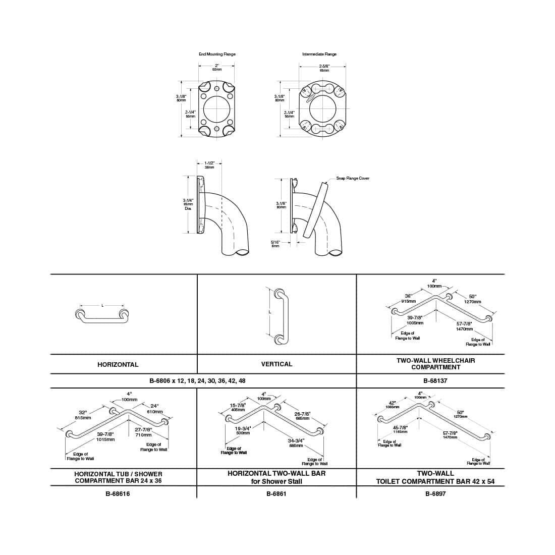 ‘ Grab bars in the Bobrick B-6806 series are manufactured from satin finish, stainless steel tubing with 1 ½” (38mm) outside diameter. Tubing is 18-8 S, type 304, 18 gauge stainless, while concealed mounting flanges are 18-8 S, type 304, 11 gauge stainless. Snap covers are 18-8 S, type 304, 22 gauge stainless.