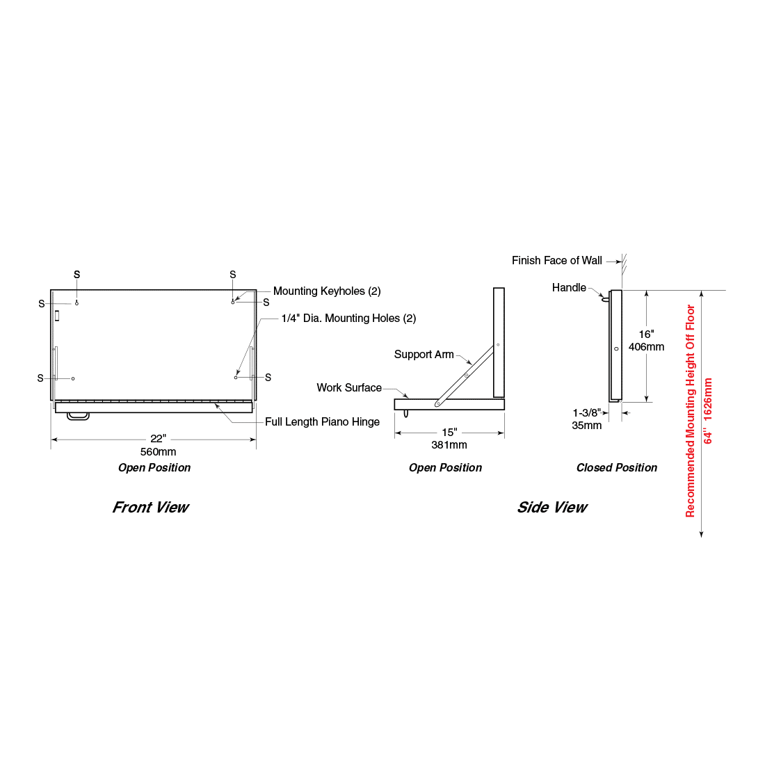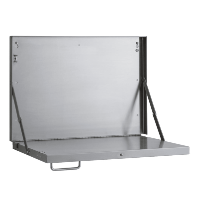 Bobrick’s B-7816 charting station and shelf unit is ideally suited to note-taking, computer usage, or instrument storage in a healthcare environment. The ample stainless steel work surface is durable and easily sanitized. When additional space is needed, the combination charting station and shelf conveniently folds up and out of the way. The closed unit projects just 1-3/8″ from the wall.