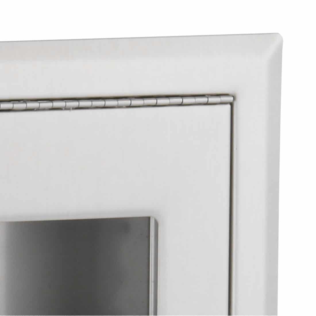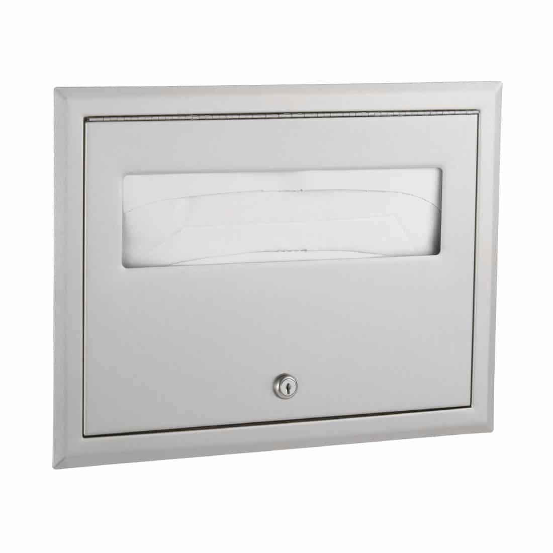 ‘ For a refined, highly-finished look, install this Bobrick ClassicSeries recessed seat cover dispenser in your washroom. Ample 500 seat cover capacity helps ensure dispenser stays stocked. The unit’s drawn and beveled, one-piece, seamless flange features a satin finish. A full-length, horizontal stainless steel piano hinge allows the door to flip up for refilling and maintenance. The included tumbler lock, keyed to match other Bobrick accessories, prevents theft and vandalism.