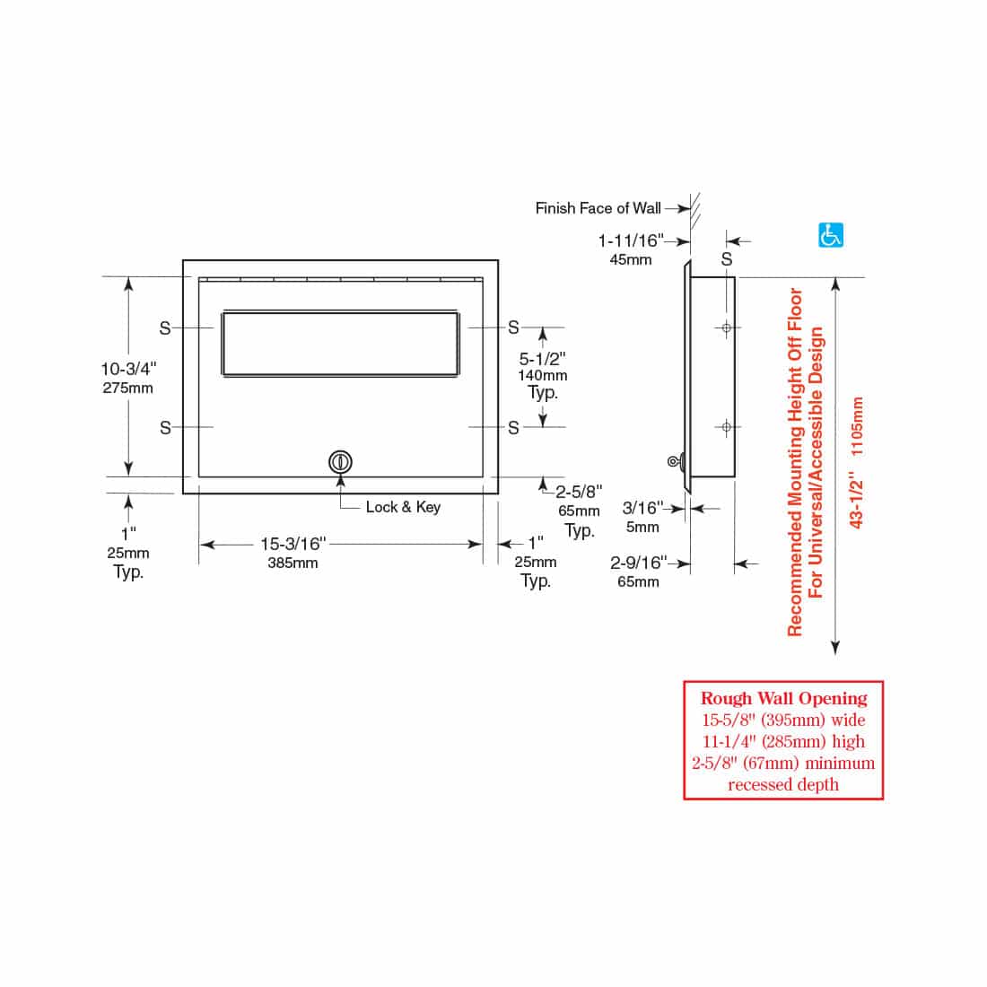 - Installs in a rough wall opening 15 5/8″ wide x 11 1/4″ high (395 x 285mm). 2 ⅝” (67mm) depth from finished face of wall is required. Four #8 screws, or similar fasteners, required for installation