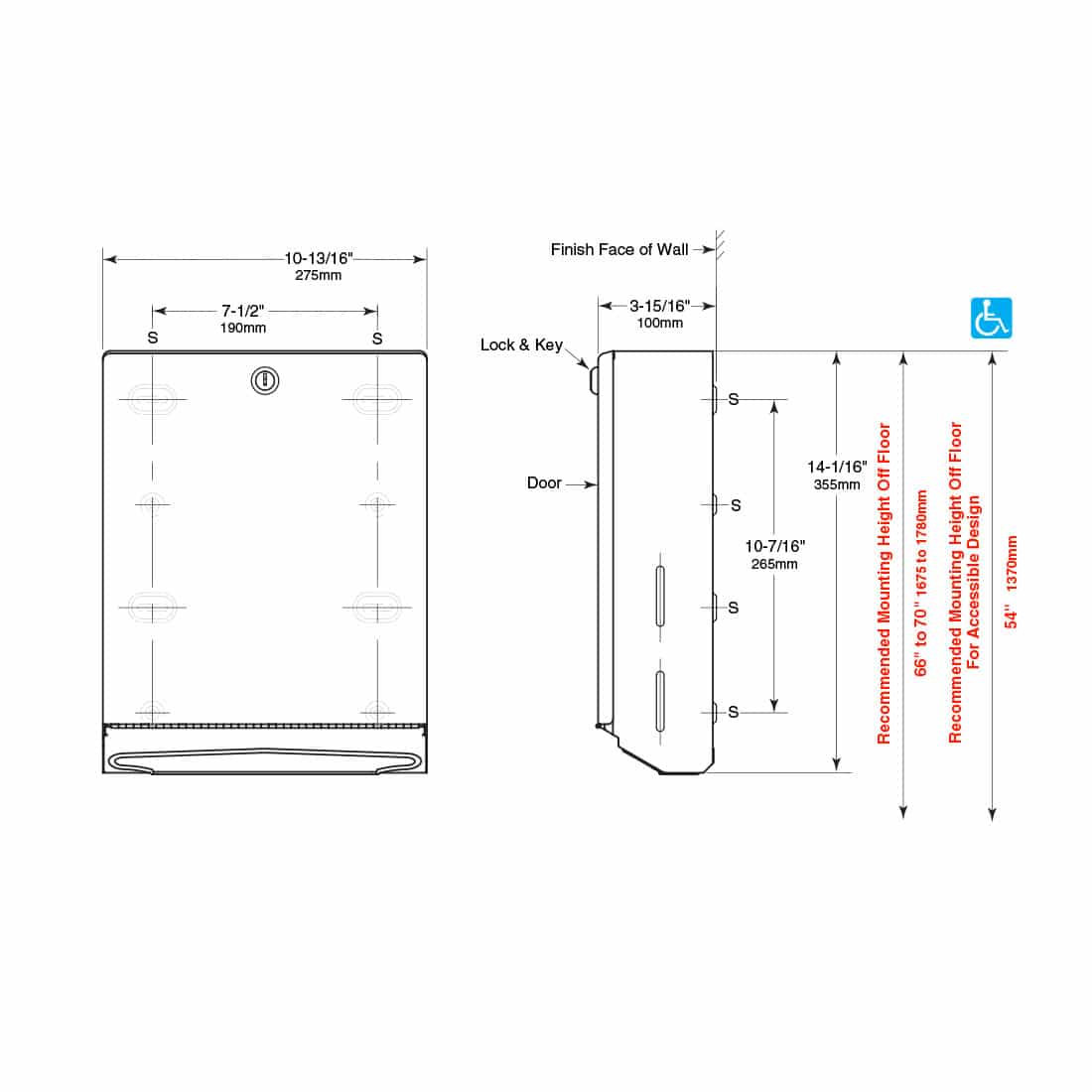 • Dispenser is 3 15/16 (100mm) deep, 10 13/16” (275mm) wide, and 14 1/16” (355mm) tall