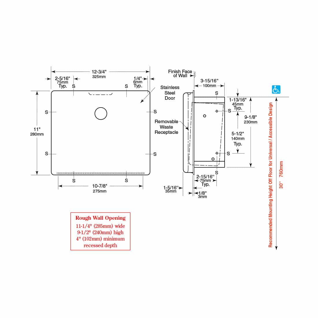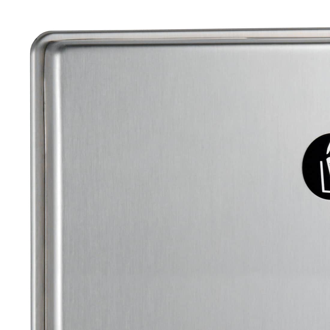 ‘ ConturaSeries accessories, like the Bobrick B-4353 recessed sanitary napkin disposal, look great and make coordinating washroom accessories simple. Corner and edge radius match other ConturaSeries items, along with the degree of the front arc. Features drawn, one piece, seamless construction.