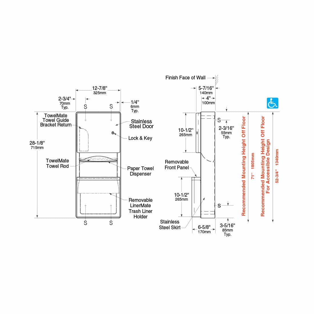‘ Bobrick’s B-43699 is the surface mounted counterpart to the B-4369 unit. The B-43699 unit is essentially with same as the recessed option, but includes a skirt designed to mount around the edges of the unit to conceal and unfinished surfaces. Perfectly coordinating with the other items in the Bobrick ConturaSeries, this combo unit works well in any bathroom. Compatibility with LinerMate and TowelMate accessories provides versatility.