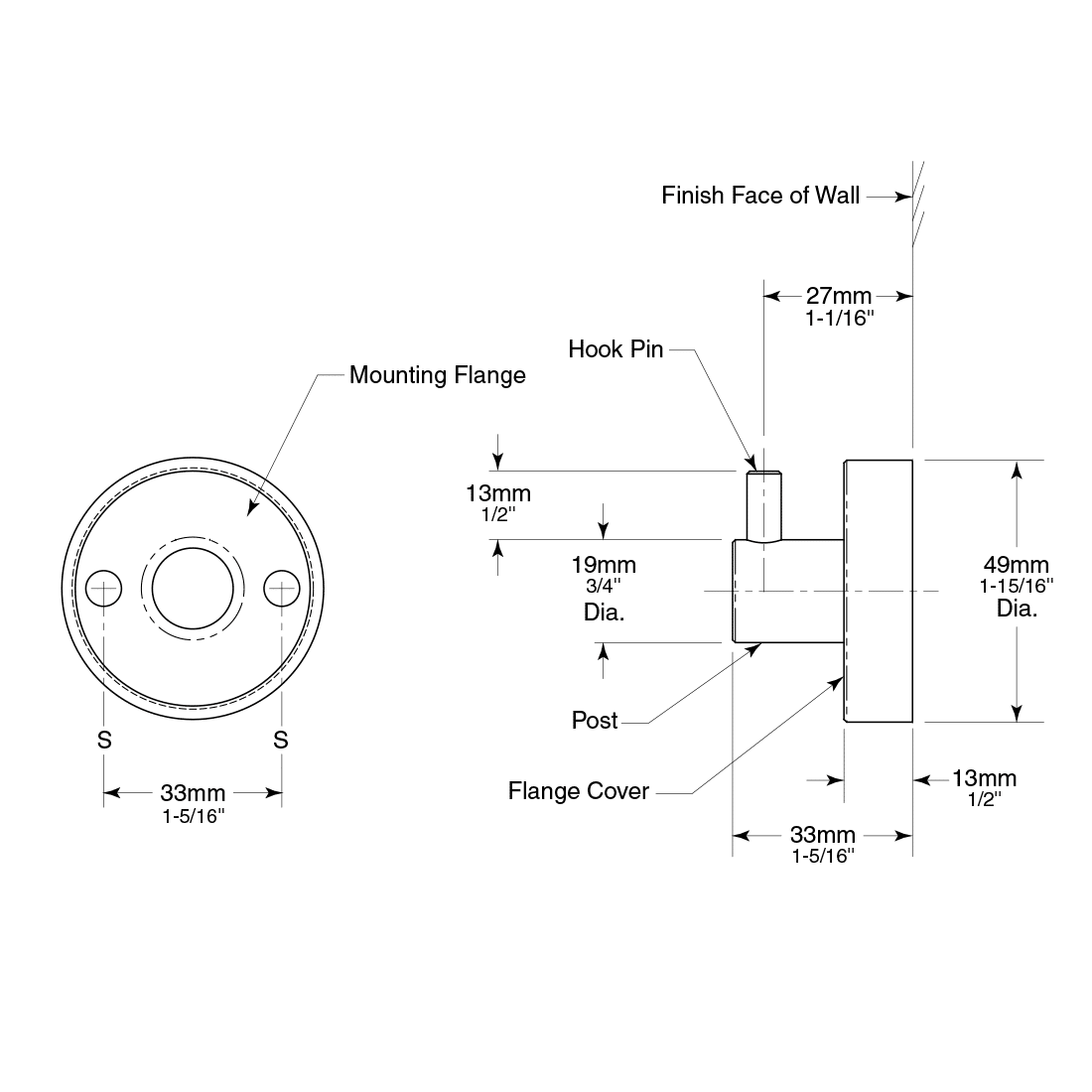 • 1-15/16″ (50mm) diameter escutcheon, 1/2″ (13mm) high hook that projects 1-5/16″ (35mm)
