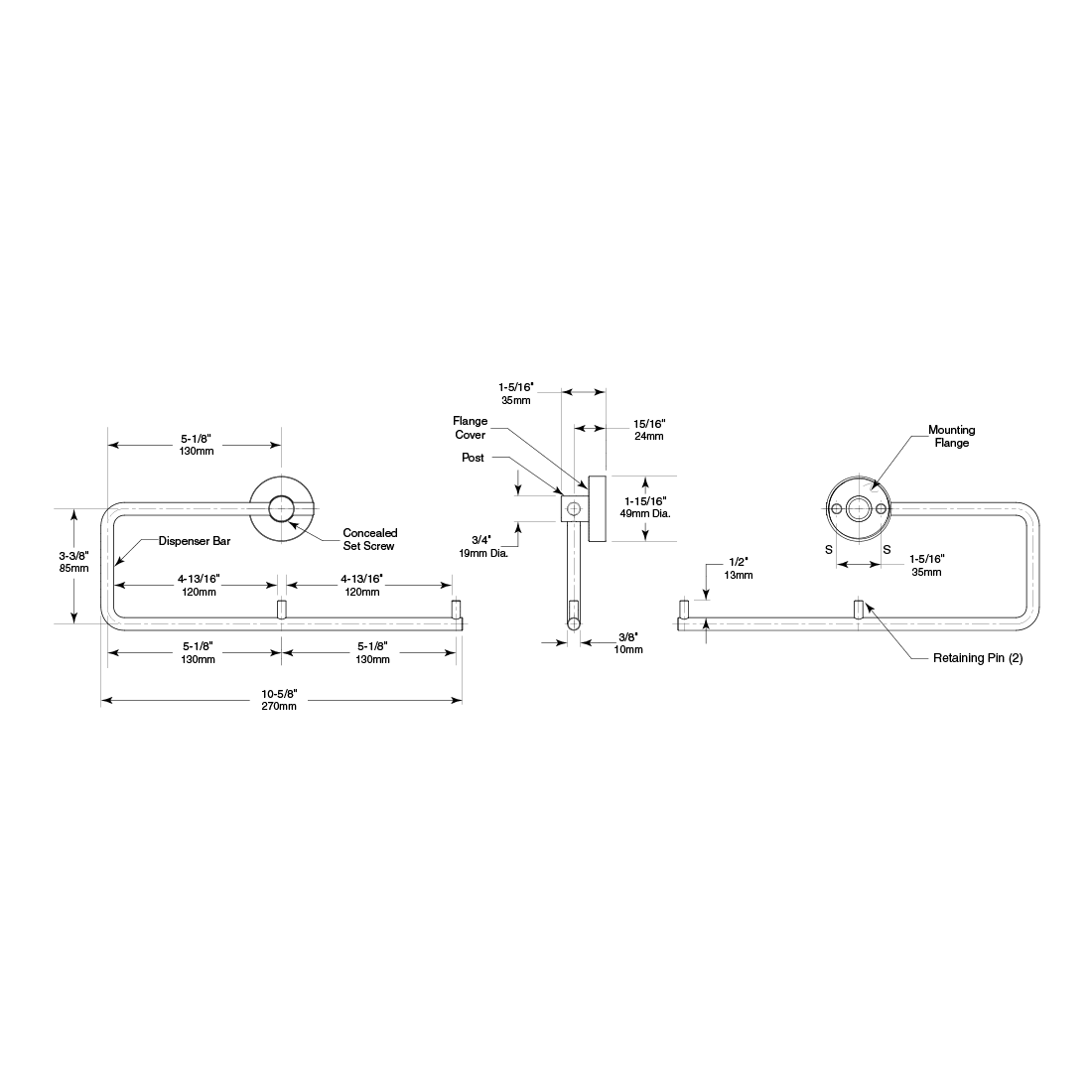 • Dispenser is 10-5/8″ (270mm) wide and projects 1-5/16″ (35mm) from wall