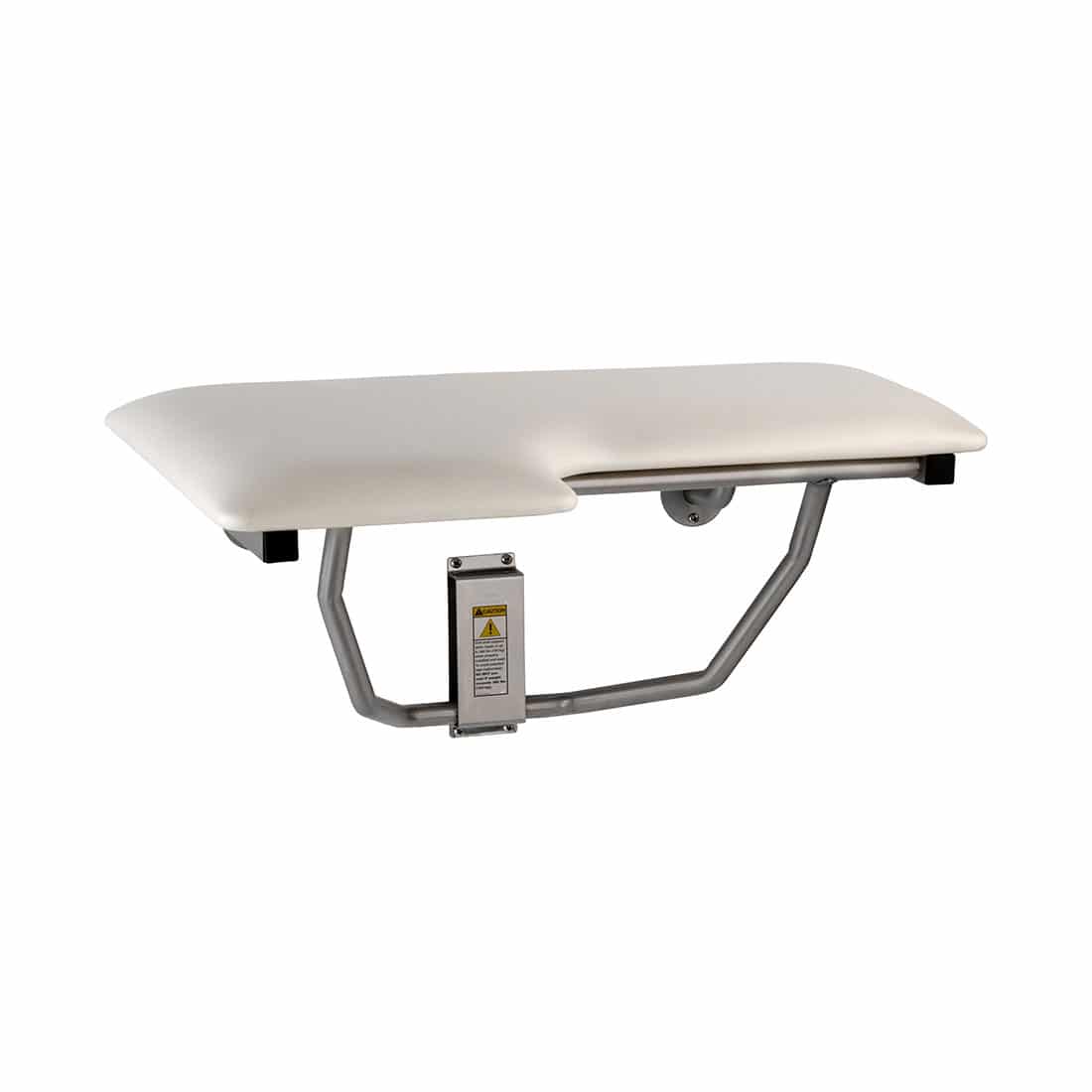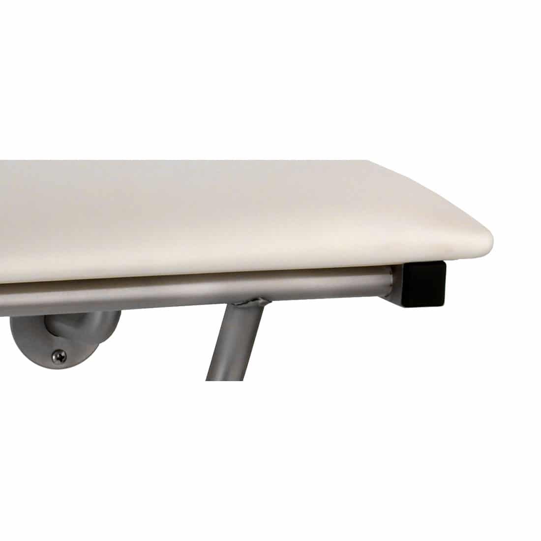 Comfort comes first with the Bobrick B-517 folding shower seat (Right Hand) with padded cushion. The B-518, left handed version, is also available making it easy to find an option that fits your shower’s configuration. Water resistant white naugahyde wraps a 1 ½” (38mm) thick, closed cell foam pad, that sits atop robust ½” (13mm) thick plywood. This padding not only adds comfort to the model but is also easy to maintain and clean making it an excellent choice for any shower. And for those looking to save space the unit also folds into a compact storage position. For an unpadded option, alternate models are available in the shower seat section of our site. Check out the Bobrick B-517 folding shower seat today.