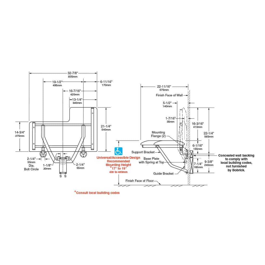 • Seat projects 22 11/16” (575mm) from the finish face of the wall when in use, seat surface is 21 ¼” (540mm) deep, at its deepest point, and 32 ⅞” (835mm) wide