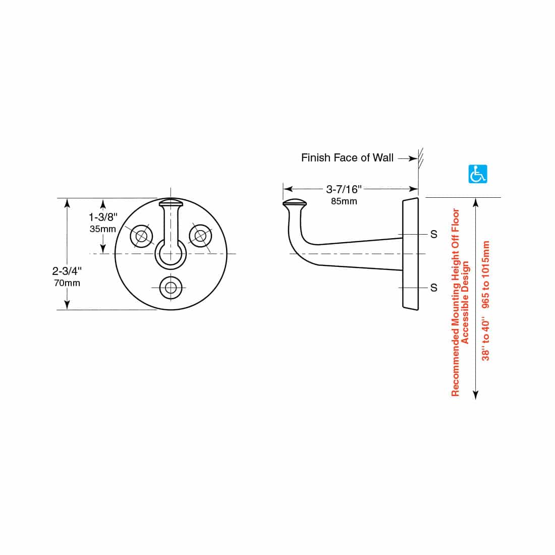 • Flange is sized 2 ¾” (70mm) in diameter, projects 3 7/16” (85mm) from finish wall