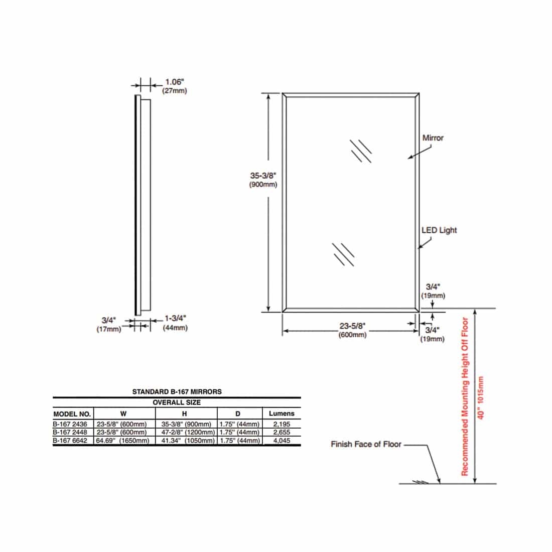 The B-167 LED edge lit mirror is a well-built option built by a trusted brand, perfect for any bathroom. Built-in LED lighting complements commercial grade glass in this Bobrick LED back lit mirror. A strong aluminum frame supports lead free silvered mirror glass. The frame features key lock holes allowing quick surface mounting in either vertical or horizontal orientations. Recessed mounting is also possible. Both the mirror and lighting components are water and corrosion resistant. Bobrick’s LED back lit B-167 mirror is perfect for public and commercial restroom use. The side lighting is both bright and simultaneously non-obtrusive in its design, allowing a full uninterrupted glass face for a sleek modern look. Don’t need integrated lighting? Consider the Bobrick B-166 Channel Frame Mirror with Shelf. For another LED lit mirror option, view the Bobrick LED Side Lit Mirror B-169.