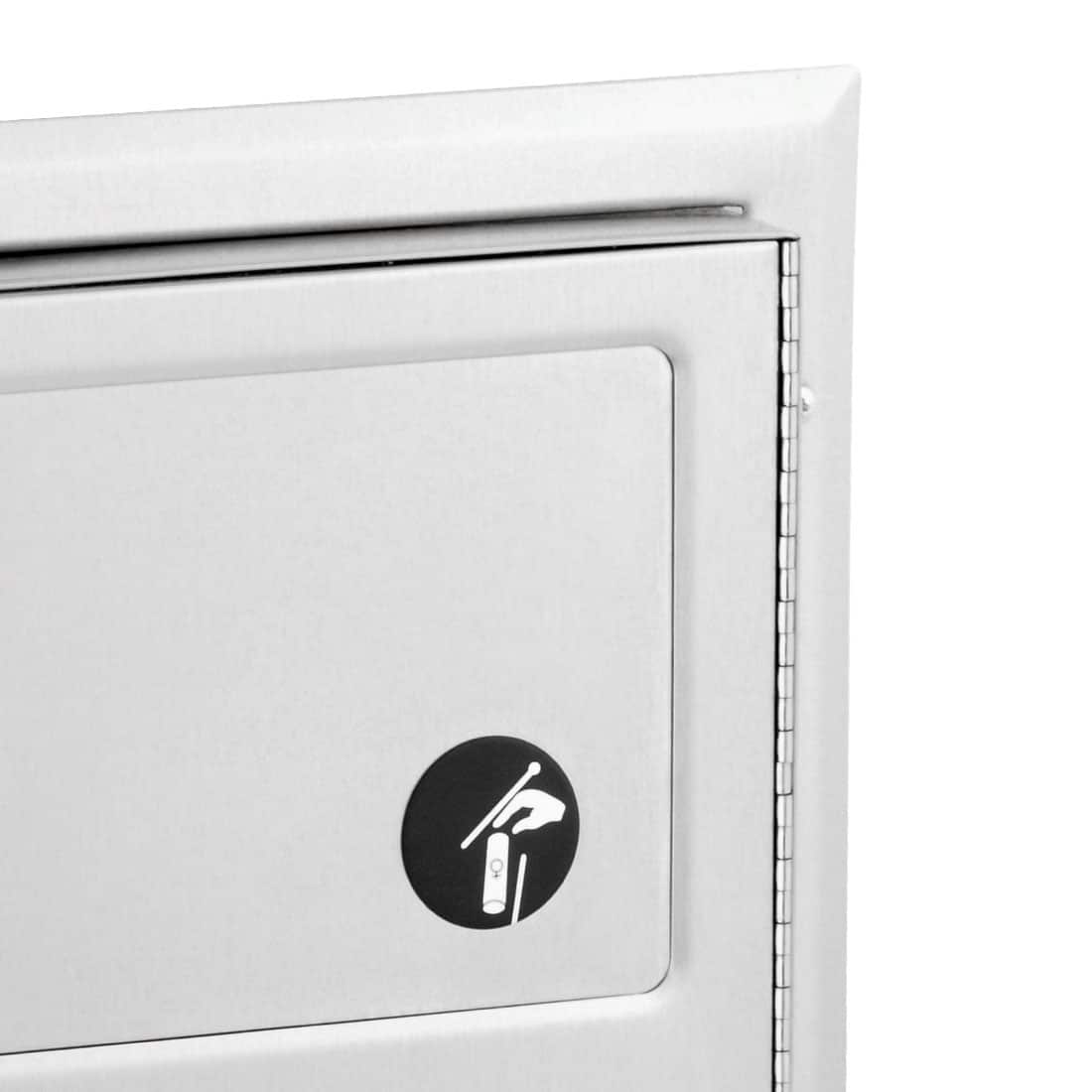 ‘ Serve two toilet compartments using the Bobrick B-354 partition mounted sanitary napkin disposal. Functionally similar to the Bobrick Recessed Sanitary Napkin Disposal B-353, this unit mounts in a cut out in a shared partition panel (wall). The waste receptacle is accessible from both sides.