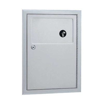 ‘ The B-353 recessed sanitary napkin disposal, from Bobrick, discreetly accepts 1.2 gal. (4.6L) of hygiene waste. Disposal panel hides the unit’s contents. The satin finish stainless steel disposal features an international graphic symbol indicating a sanitary disposal.
