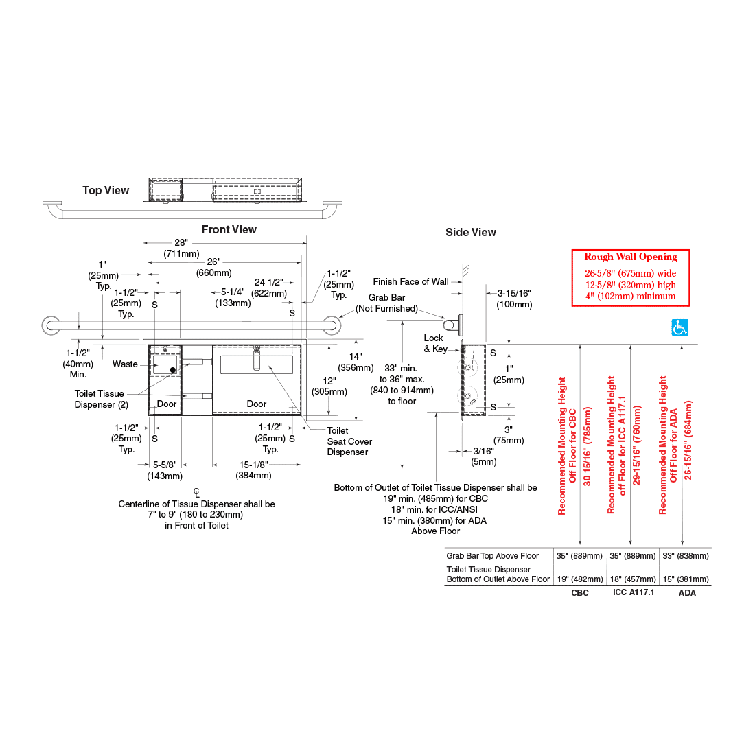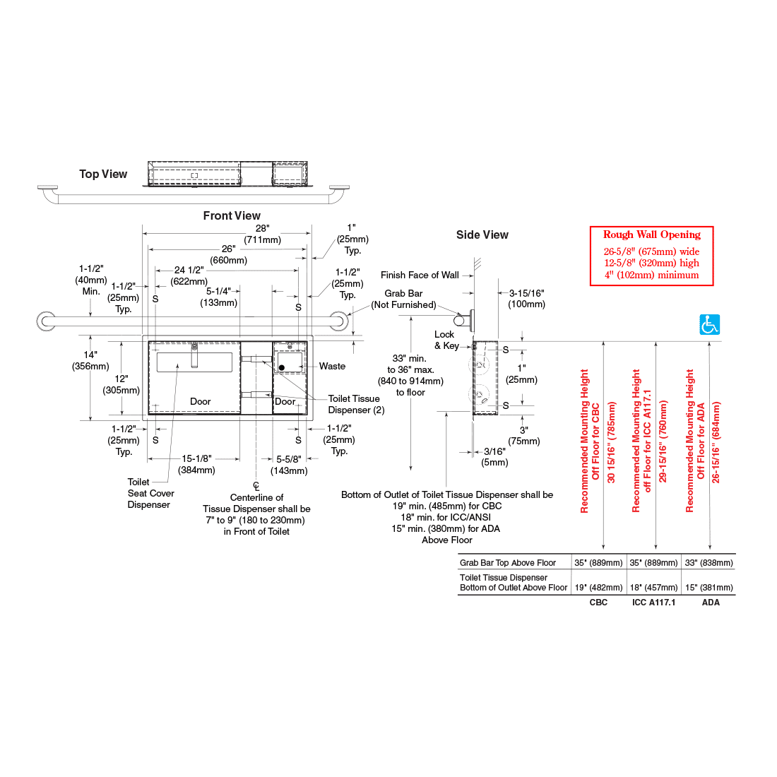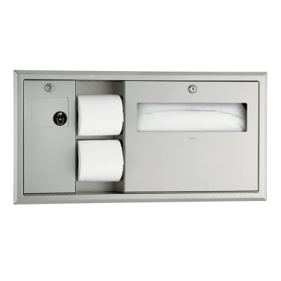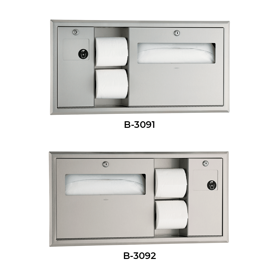 The Bobrick B-3091 combo unit packs exceptional functionality into a compact chassis, featuring ClassicSeries styling. This unique, recessed-mounted accessory includes space for a 500-count box of toilet seat covers and two rolls of toilet tissue. Bobrick included a handy 0.4 gallon (1.5 L) removable waste disposal as well. The flush-mount design (projecting just 3/16″ (5mm) from the wall surface) works well with grab bars, allowing full accessibility compliance when properly installed.