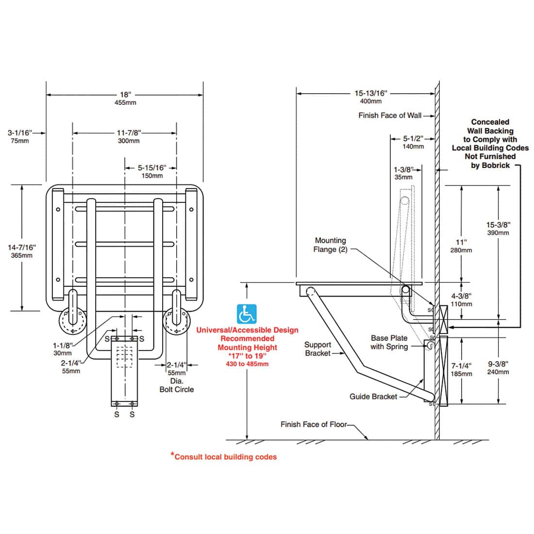 Install the versatile phenolic Bobrick B-5191 Folding Shower Seat in showers, baths, and dressing areas. The seat stows against the wall, but easily folds down for use. Integrated drainage, stainless frame, and phenolic surface guarantee bacteria and germ resistance. ADA compliant design will withstand years of regular use provided the seat is installed properly. Need a larger shower seat? Consider the Bobrick Solid Phenolic Folding Shower Seat B-5181. If you find that the compact nature of the Bobrick B-5191 folding shower seat appealing, then this may be the perfect choice for your bathroom.