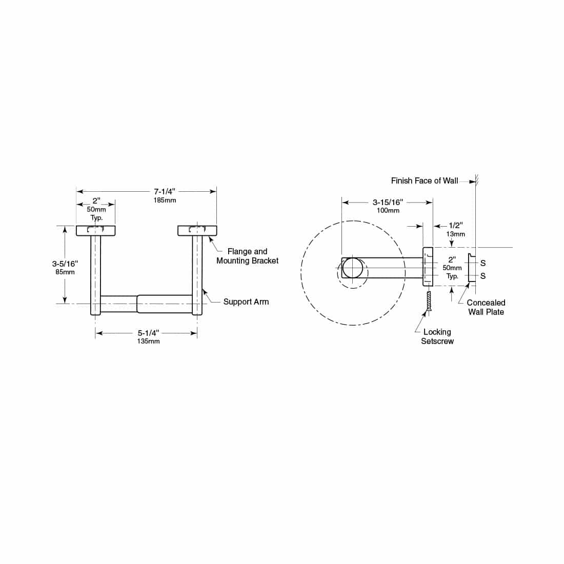 • Flanges, support arms, and concealed wall plates constructed from 18-8, type 304 stainless steel. Chrome plated plastic spindle