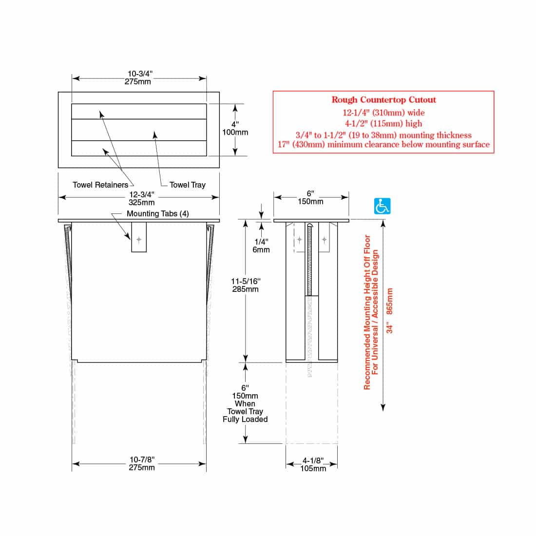 ‘ Supply paper towels from the lavatory/countertop – just inches from restroom wash basins. The B-526 TrimLineSeries paper towel dispenser, from Bobrick recess mounts into horizontal surfaces like lavatories, vanity tops, and counter tops. The unit can also slot into vertical surfaces like table aprons, skirts, or the front of cabinets.