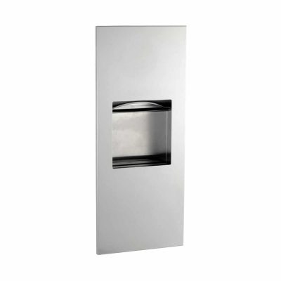 ‘ “Sleek” best describes the look of the B-36903 TrimLine recessed paper towel dispenser and waste receptacle from Bobrick. One large, smooth surfaced door conceals the paper towel dispenser and the waste receptacle bin. A single opening in the door allows users to pull down a towel from the top, or discard used towels and wastes into the bin at the bottom of the opening. This combination unit blends well in any bathroom, and perfectly compliments other TrimLine accessories from Bobrick.