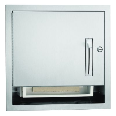Bradley’s 2483 Lever Roll-Towel Dispenser contains one standard 8″ core paper towel roll and is secured with both a hinge and a lock for additional security