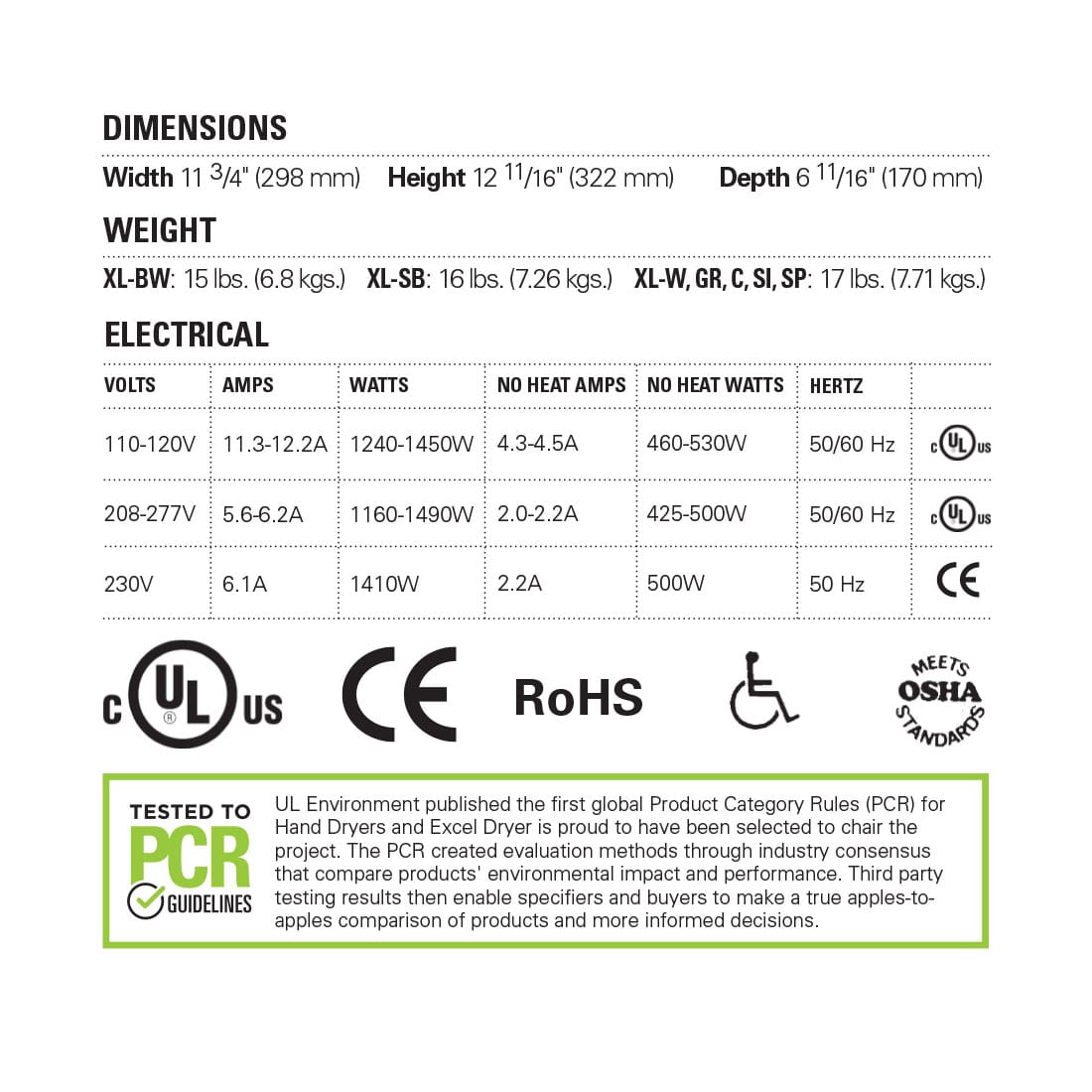 Read more about the features and specifications (PDF) of the XLERATOR hand dryer. New enhanced standard features include adjustable speed and sound control, adjustable heat settings, multi-voltage options, and a service LED.