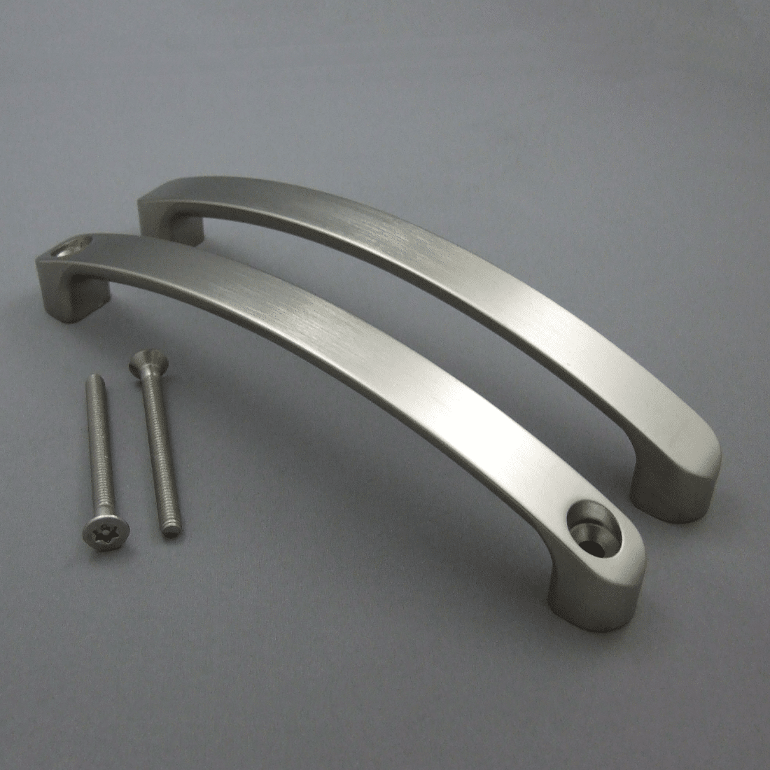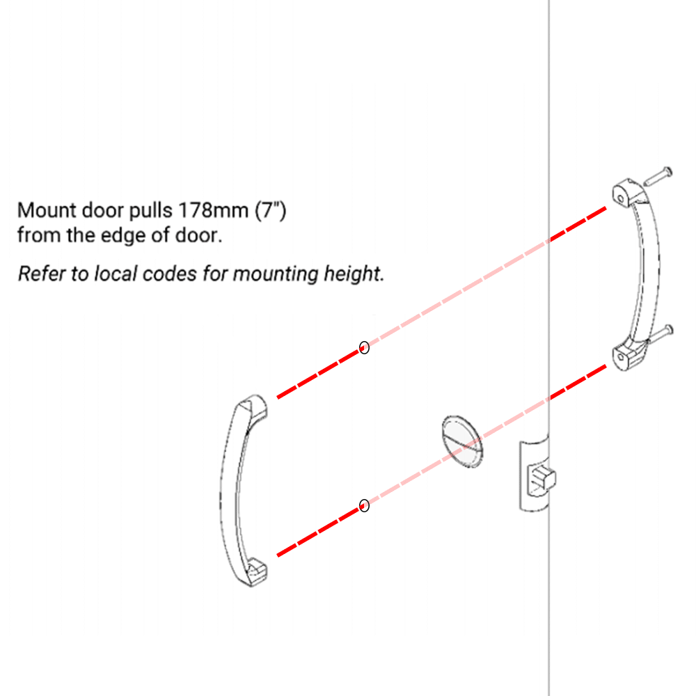 To install, simply drill two appropriately-sized holes for the mounting screws, using the door pulls as a guide. Door pulls should be mounted 7″ (178mm) from the edge of the door, per manufacturer recommendation. Refer to local codes for appropriate mounting height. Temporarily hold door pulls in place (with the threaded door pull positioned on the exterior side of the door) and begin tightening screws.