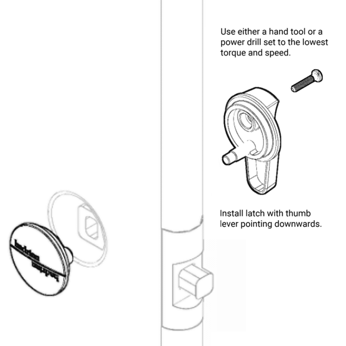 To install, simply loose fit the components – with the interior latch’s thumb lever pointing downward – aligning the two pins of the knobs and then engage the fastener.