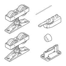 Fitting Sets | Hawa Junior 40/Z Fitting Set (940.41.006) consists of (2) running gear, (2) two-way suspension fittings with hanger bolts and M8 nut, (1) track buffer with retaining spring, (1) wall buffer, (1) floor guide with zero clearance, (1) height adjusting pin. |