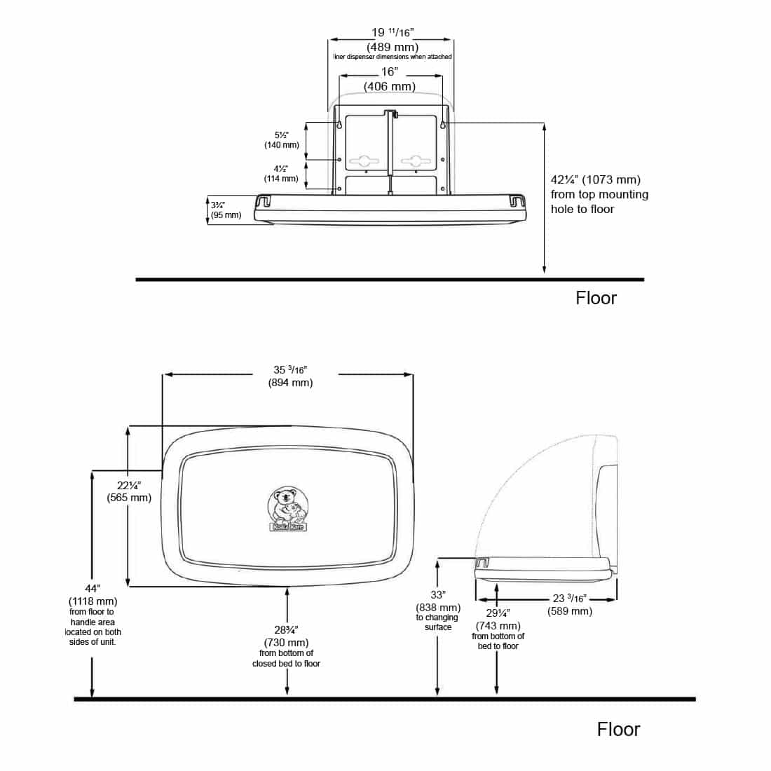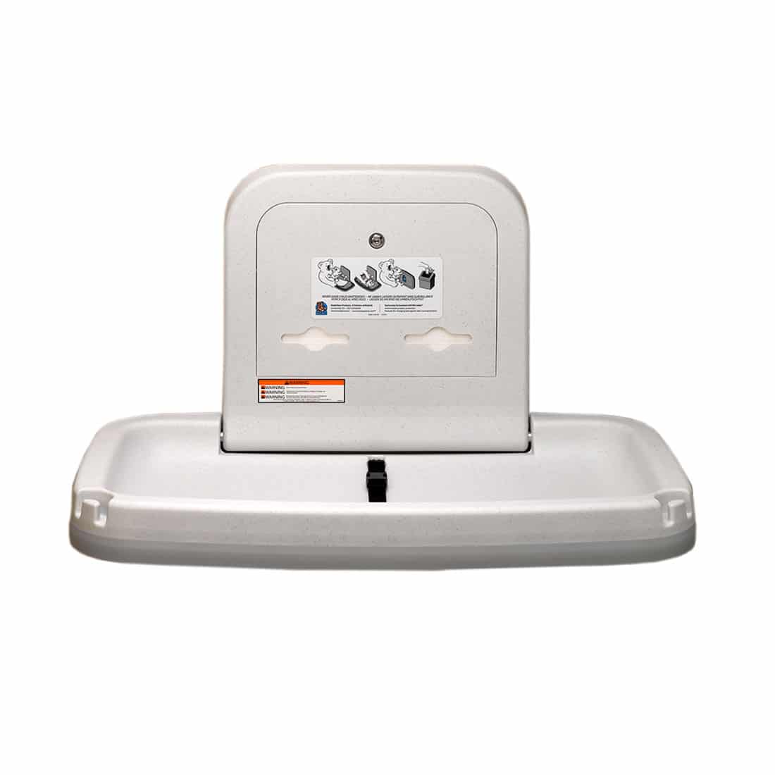 Enhance the decor of your restroom with the stainless steel KB200-SS horizontal surface mounted baby changing station from Koala Kare. Select either gray or white granite high-density polyethylene as the base color for the changing station. A contrasting panel of type 304 brushed stainless steel appoints the exterior of the unit. The veneer adds minimal weight – the station opens and closes easily with the assistance of a pneumatic cylinder. Microban surface protection, included safety straps, and a built-in liner dispenser round out the Koala Kare KN200-SS feature set.