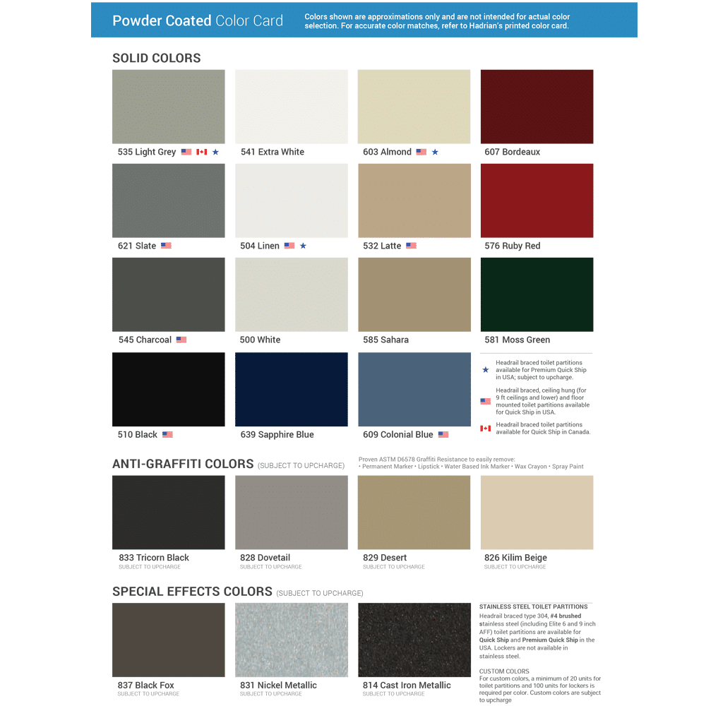 Powder-coated steel is the material of choice for toilet partitions in North America. It offers entry-level pricing and good durability. When properly cared for, the material will last many years in medium-traffic environments. Also called “painted steel” and “baked enamel” (referring to a defunct painting process), powder-coated steel comes in a full spectrum of colors. Hadrian Manufacturing – our supplier of powder-coated steel, offers more than 20 unique hues. View our color charts for a complete list of options. Note that anti-graffiti and special-effect colors carry an upcharge and may increase lead time.