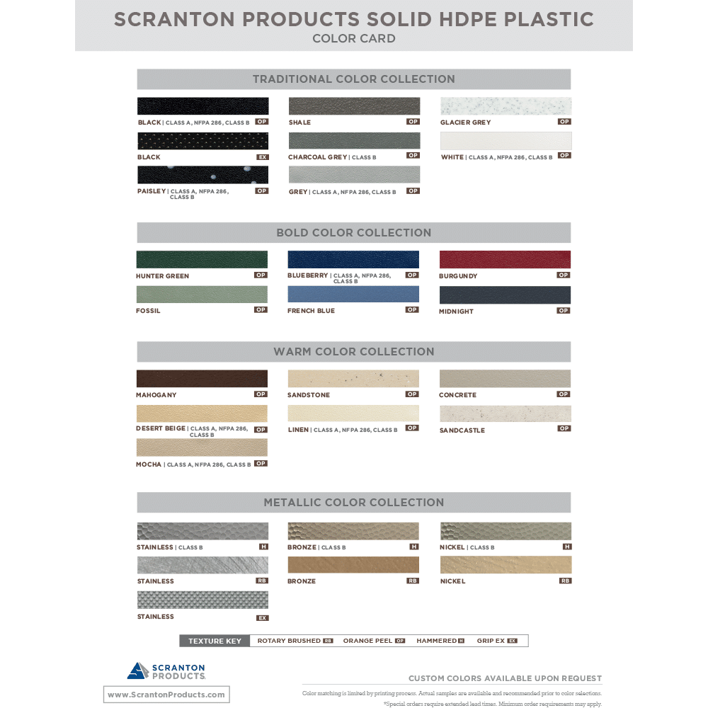Finish | Black, Blueberry, Burgundy, Charcoal Grey, Concrete, Desert Beige, Fossil, Glacier Grey, Grey, Hunter Green, Linen, Mahogany, Midnight, Mocha, Paisley, Sandcastle, Sandstone, Shale, White, Bronze Hammered, Nickel Hammered, Stainless Hammered, Bronze Rotary Brushed, Nickel Rotary Brushed, Stainless Rotary Brushed, Black EX, Stainless EX |