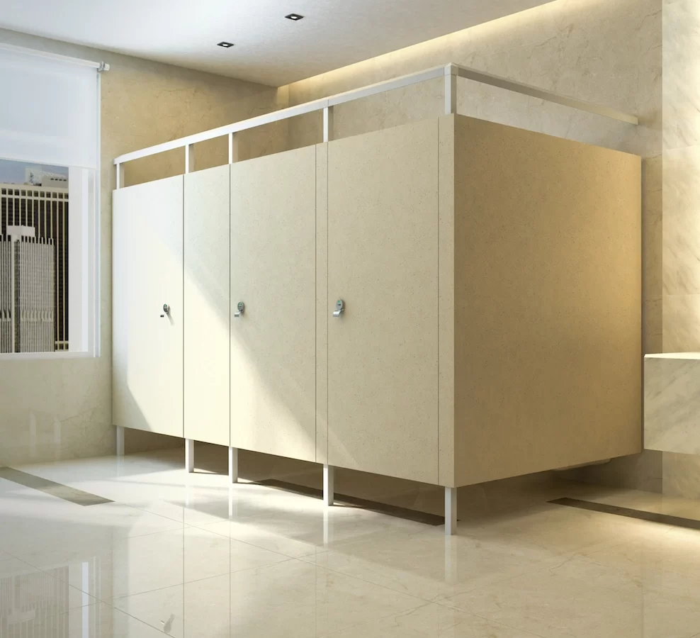 High Pressure Laminate (HPL) bathroom cubicles are great for the customer looking for a customizable design without breaking the budget. Made of particle board, imbued with resin and covered with a laminate sheet, these toilet partitions aren’t suited for high moisture environments such as pools. But for dry environments they offer over 400 colors and patterns, including wood patterns. High Pressure Laminate partitions are well suited to office and hotel bathrooms because of their customizability and low price point. Additionally, they are also both impact and scratch resistant, making them a reliable option for years to come.