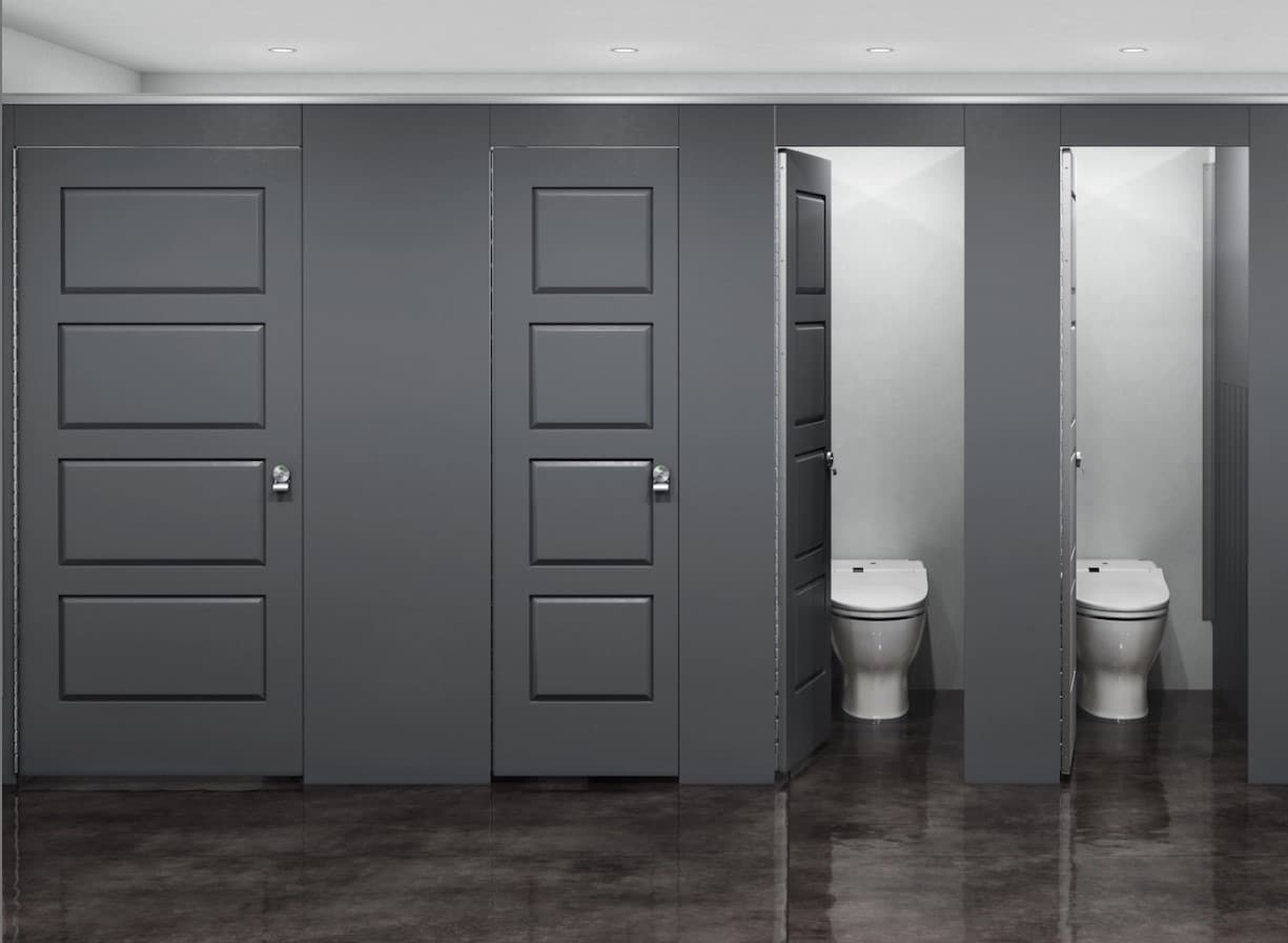 Hiny Hiders is Scranton’s line of “standard” HDPE/solid plastic toilet partitions. Hiny Hiders provide privacy and design refinement that works well in most public restrooms. Hiny Hiders offer the benefits of solid plastic partitions (primarily moisture resistance and durability) at a minimal price. The stalls include hardware that’s enhanced to support the heft of plastic (relative to metal or wood). It is also corrosion-resistant, unlike the pot metal brackets, hinges, and latches provided with wood and metal stalls.