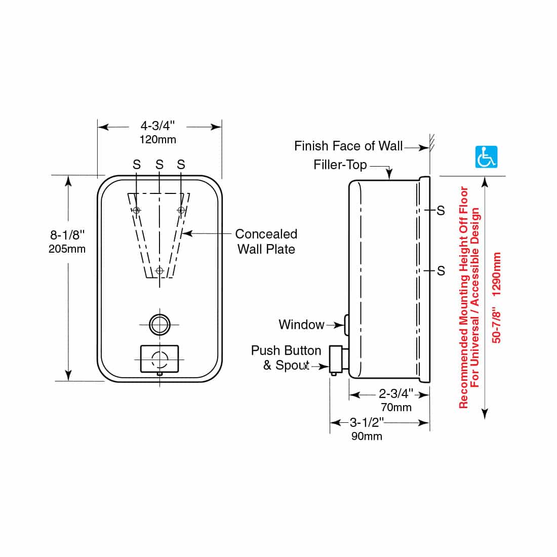 - 4 ¾” (120mm) wide by 8 ½” (205mm) high. Projects 3 ½” (90mm) from wall