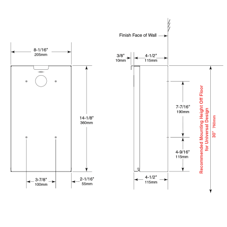• Cabinet extends 4-1/2″ (115mm) from the finished face of the wall, 8-1/16″ (205mm) width and 14-1/8″ (360mm) height
