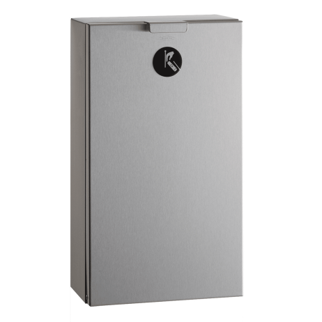As part of Bobrick’s TrimLineSeries, the B-35139 surface-mounted sanitary napkin disposal features clean lines and satin-finish stainless steel exterior. A magnetic catch and door-swing limiting cable allow easy opening, closing, and maintenance. The unit’s 0.6 gallon (2.3 L) waste receptacle is removable for servicing.